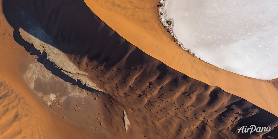 Sossusvlei 地区绵延的沙丘被称为“星形”沙丘:风从四面八方逼近它们,使它们呈现出各种形状。而这个地方,在遥远的过去,是一片绿洲。然后沙子和太阳消灭了植物的生命,现在这是死谷,或者,如果更准确地翻译它的名字,“死沼泽”。
